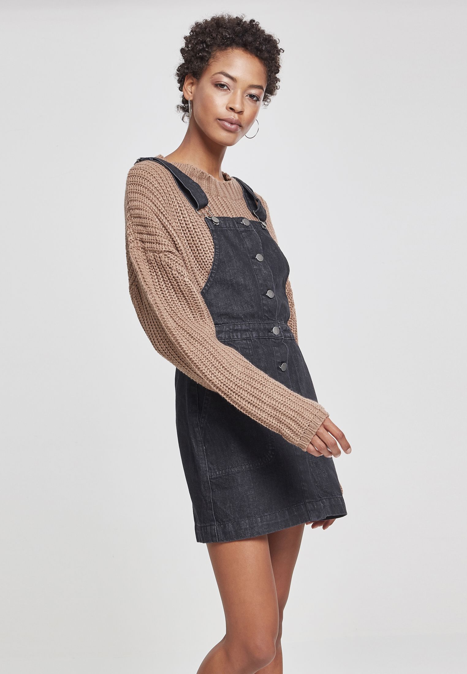 The thigh-length denim dungaree dress features classic details, such as the adjustable straps and a placket that runs down the entire front and can be opened completely. This casual item looks great worn over a T-shirt or sweatshirt.