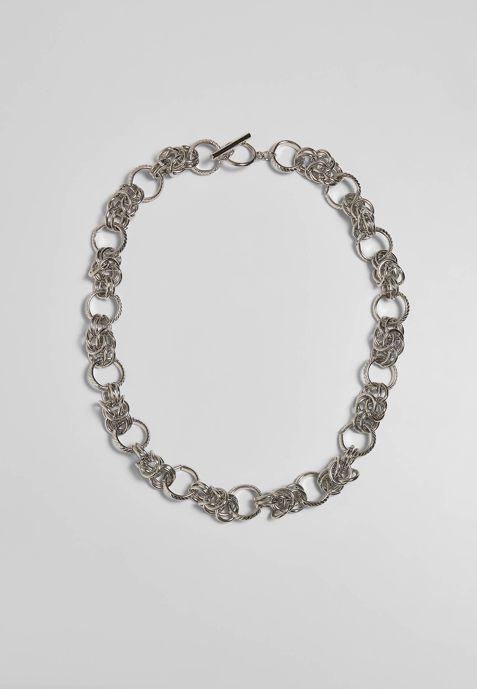 The Urban Classics necklace impresses with an intertwined design with alternating ring and double anchor chain elements. The pretty piece of urban jewelry uses a practical snap fastener as closure and is made of iron and a zinc alloy. It sits medium high and is 47 centimeters long.
