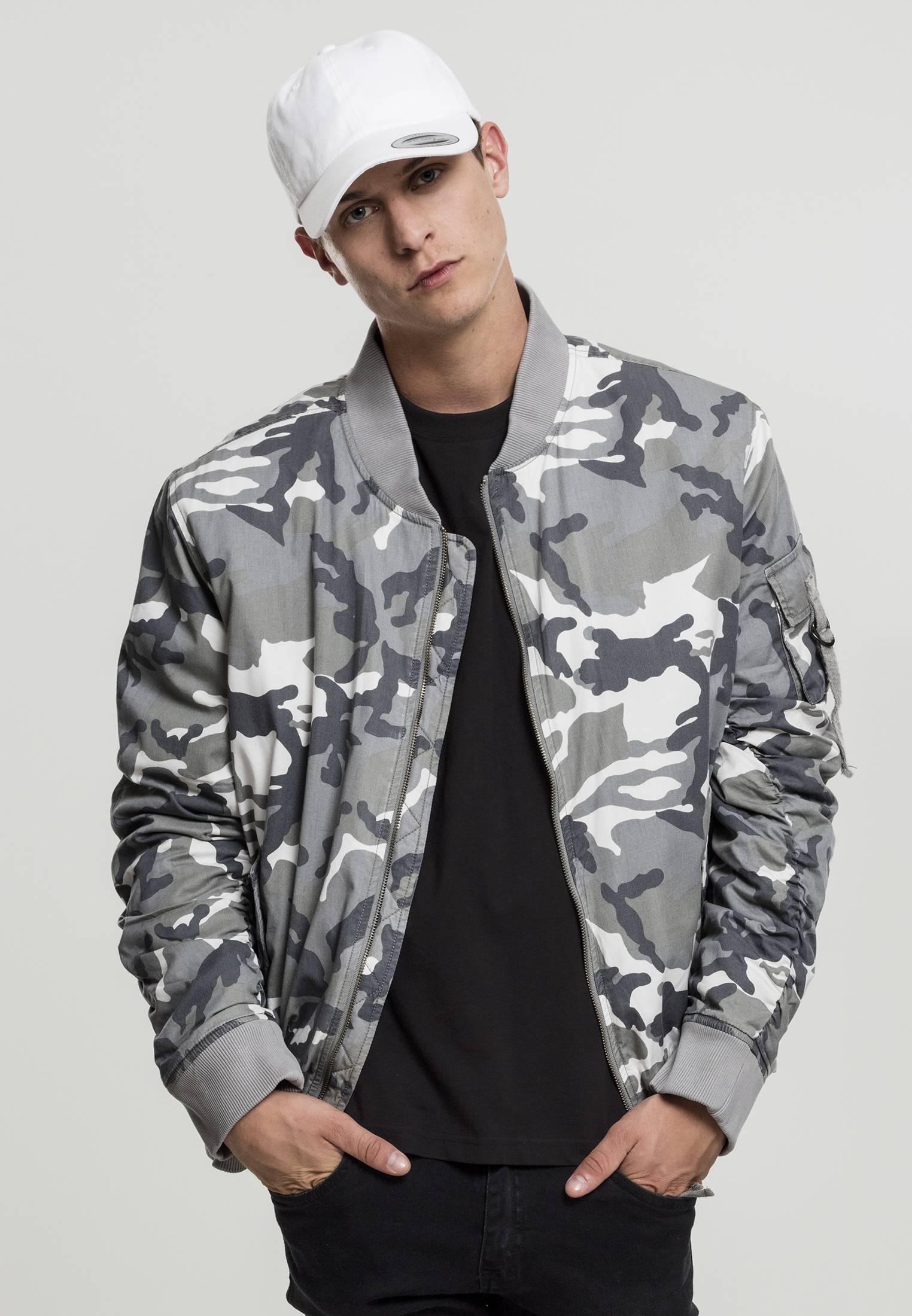 The Vintage Camo Cotton Bomber Jacket have all the typical bomber features – lightly gathered sleeves, upper arm pocket, side flat pockets and small rib collar. But the camouflage pattern and the washed look give this classic a completely new, cool look – a must-have for bomber fans.